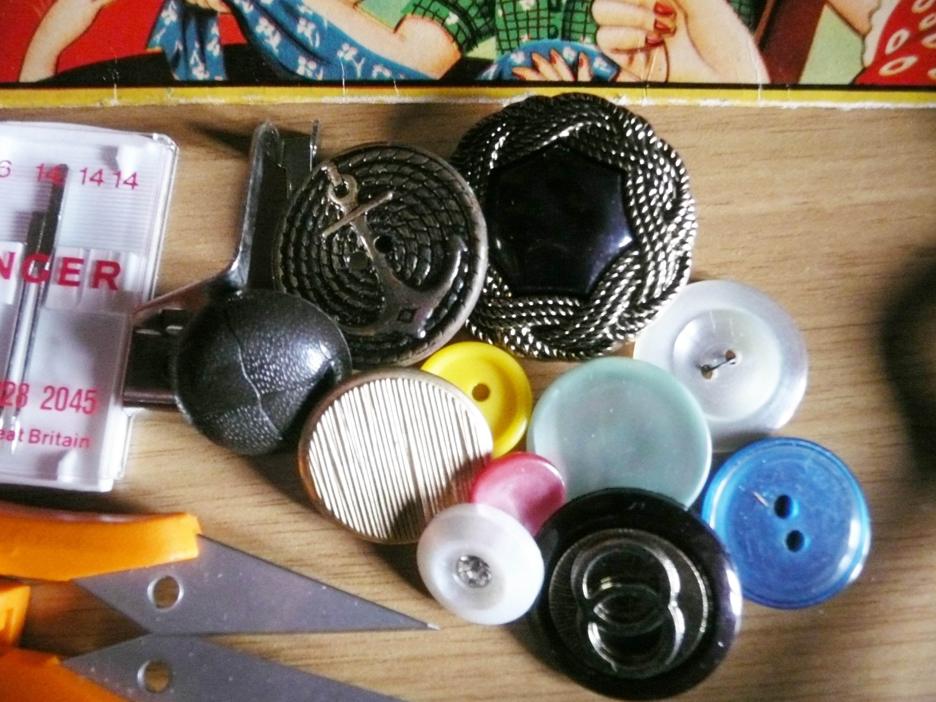 In sewing class, you had to have a whole array of notions: red pin cushion, a tin box of Sucrets for bobbins, a seam ripper, a thimble, pinking shears and scissors, a button box, snaps, a can of very fine oil for your sewing machine, and of course the obligatory set of needles.